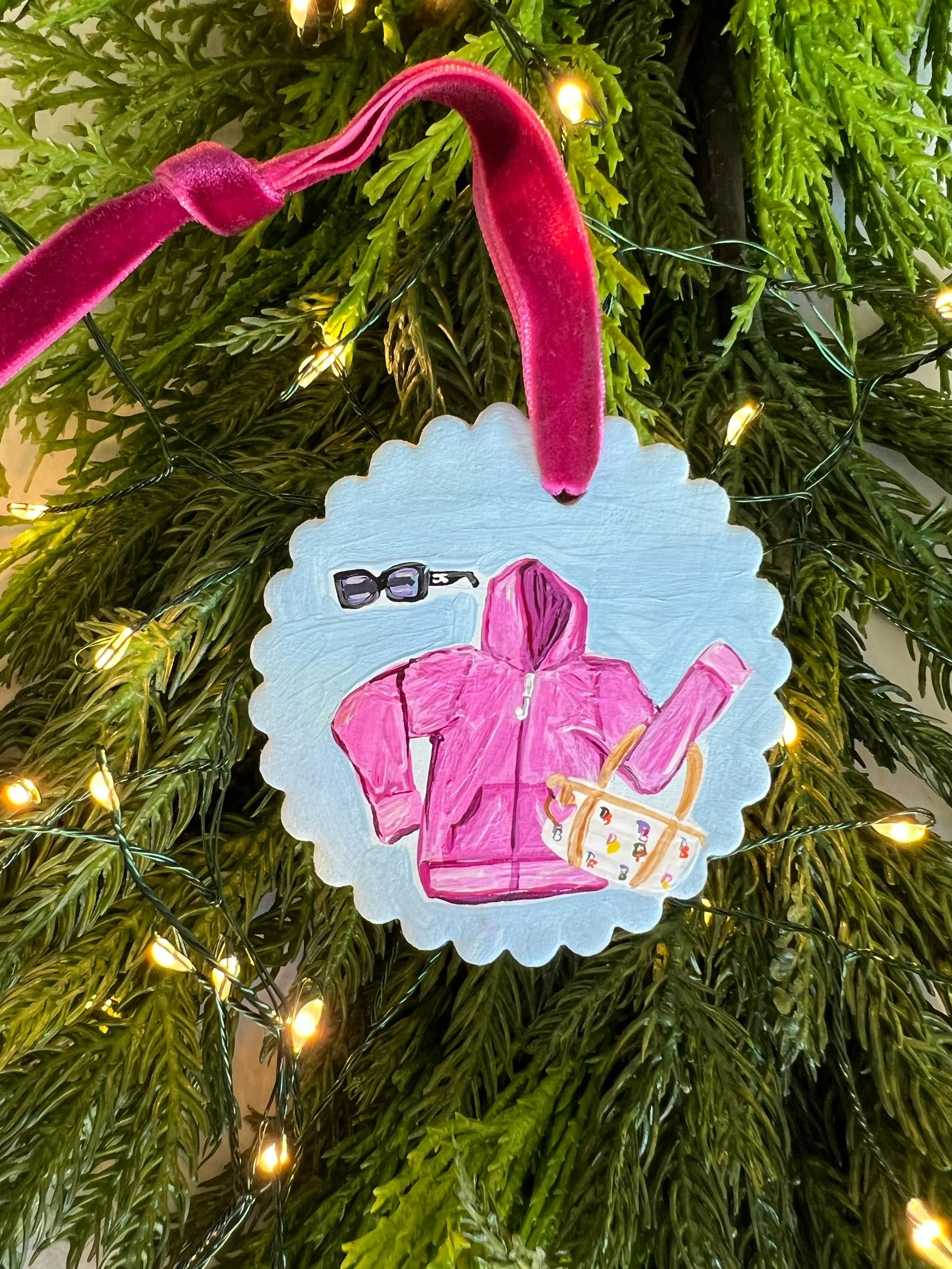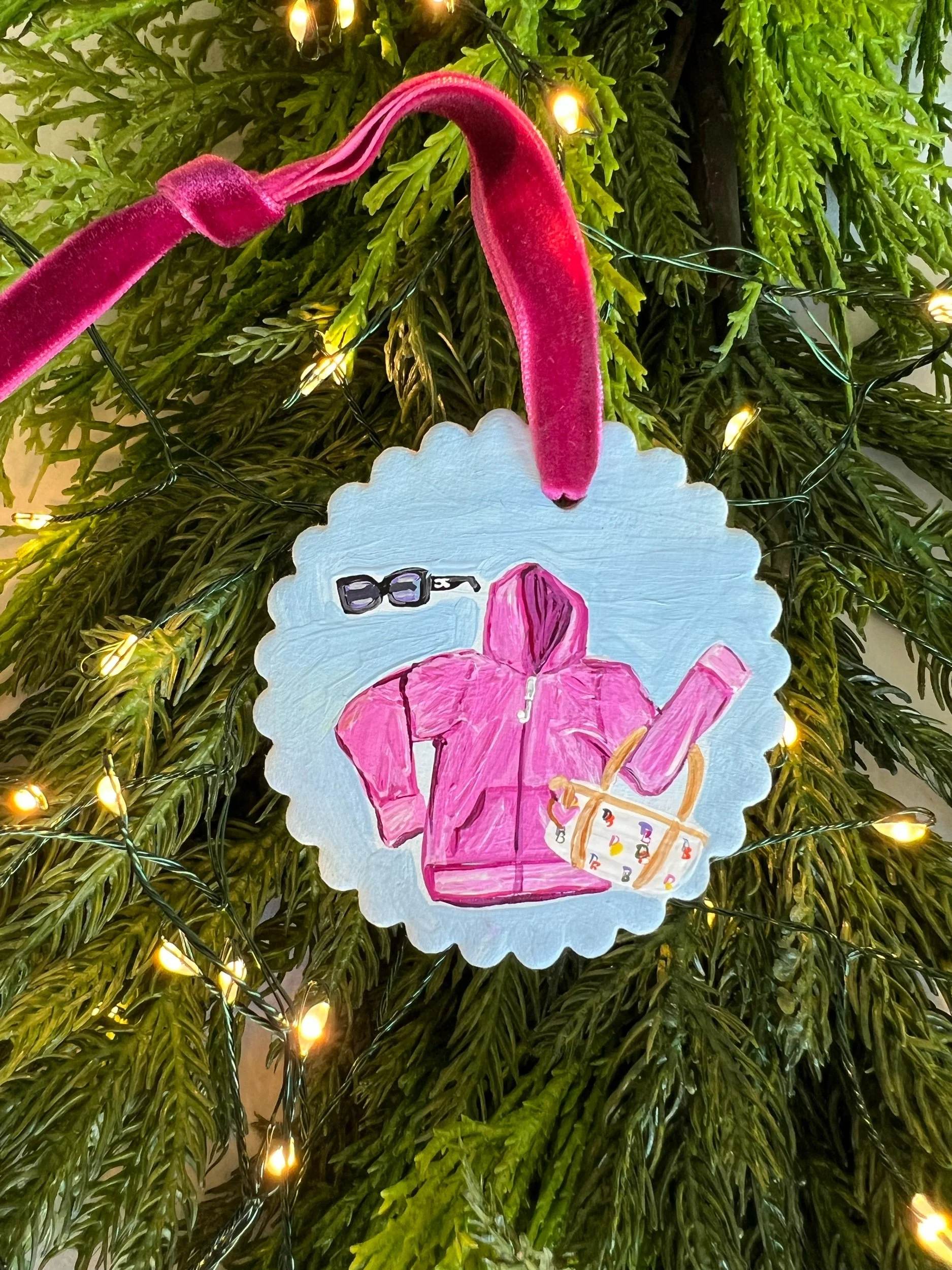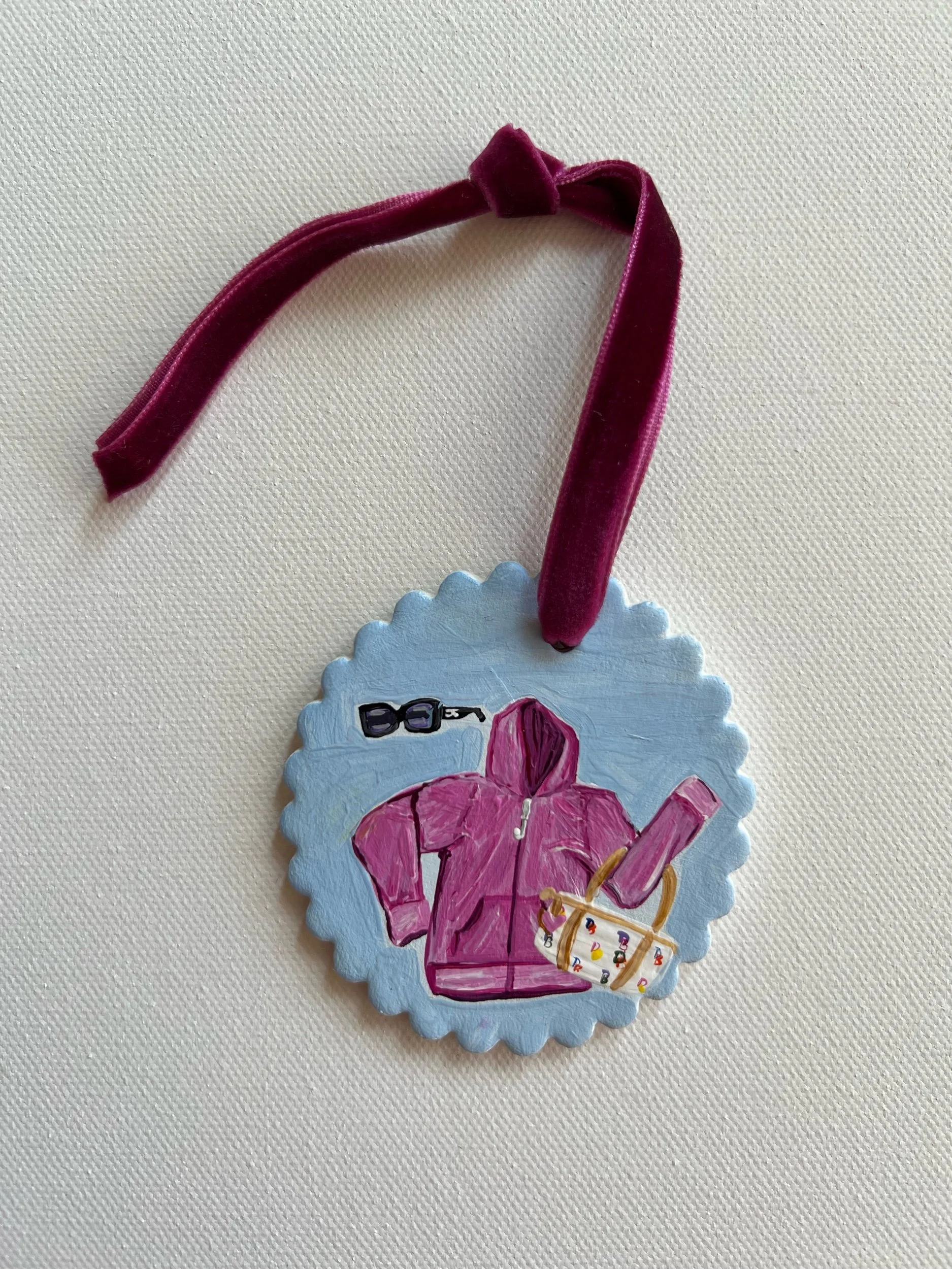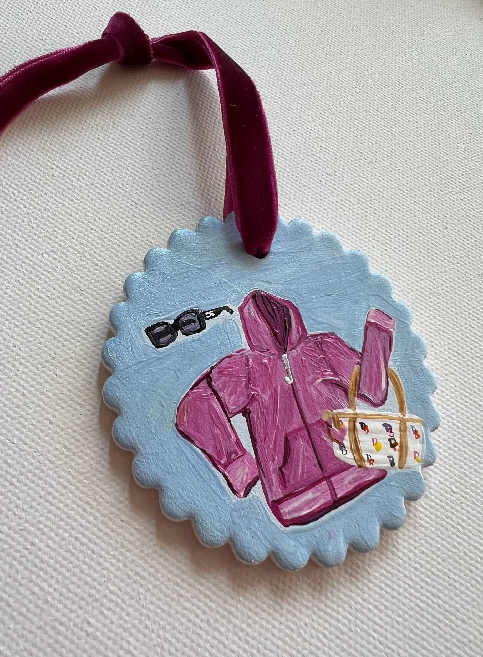 Acrylic on handmade bisque ornament with scalloped edges