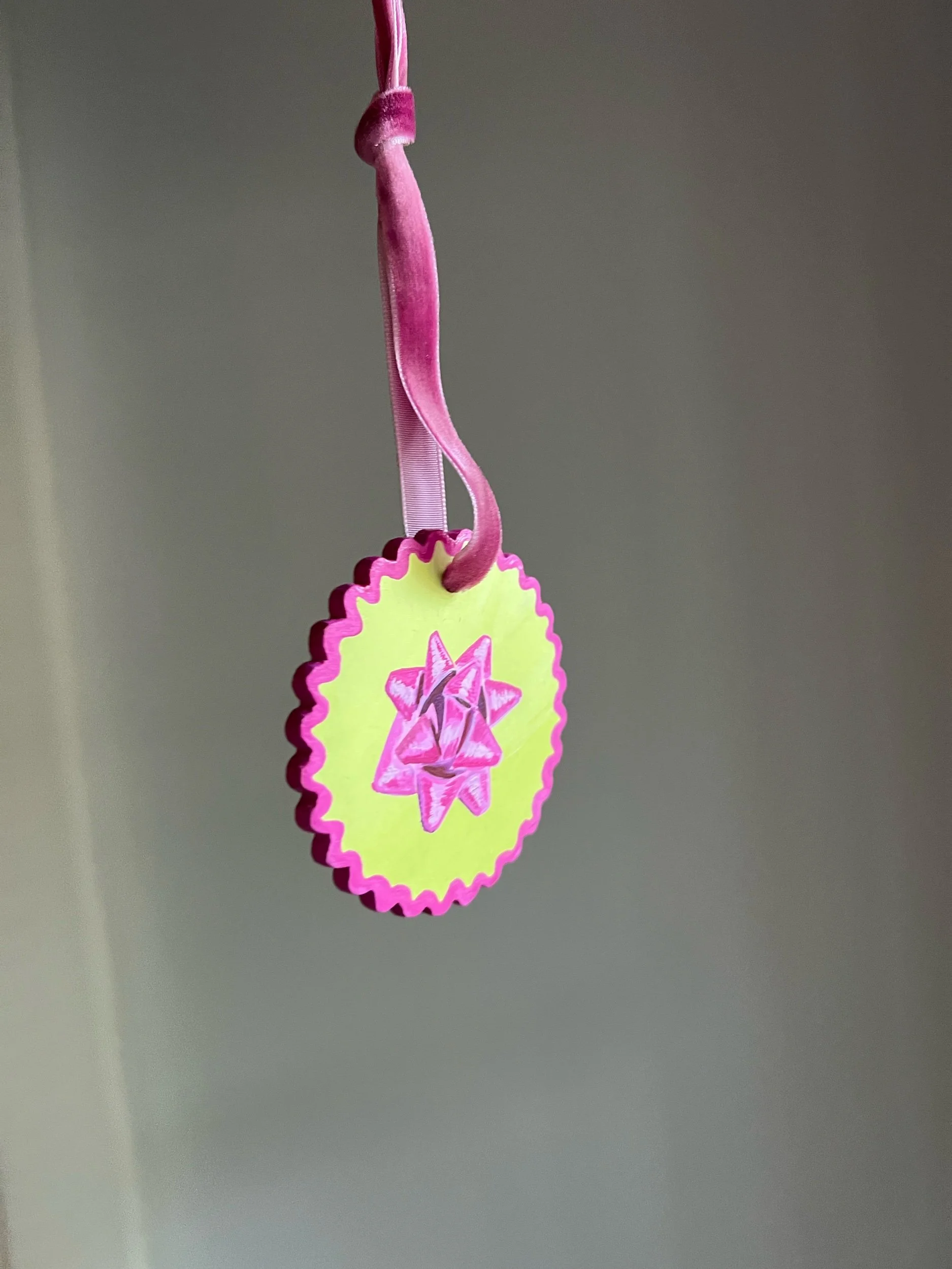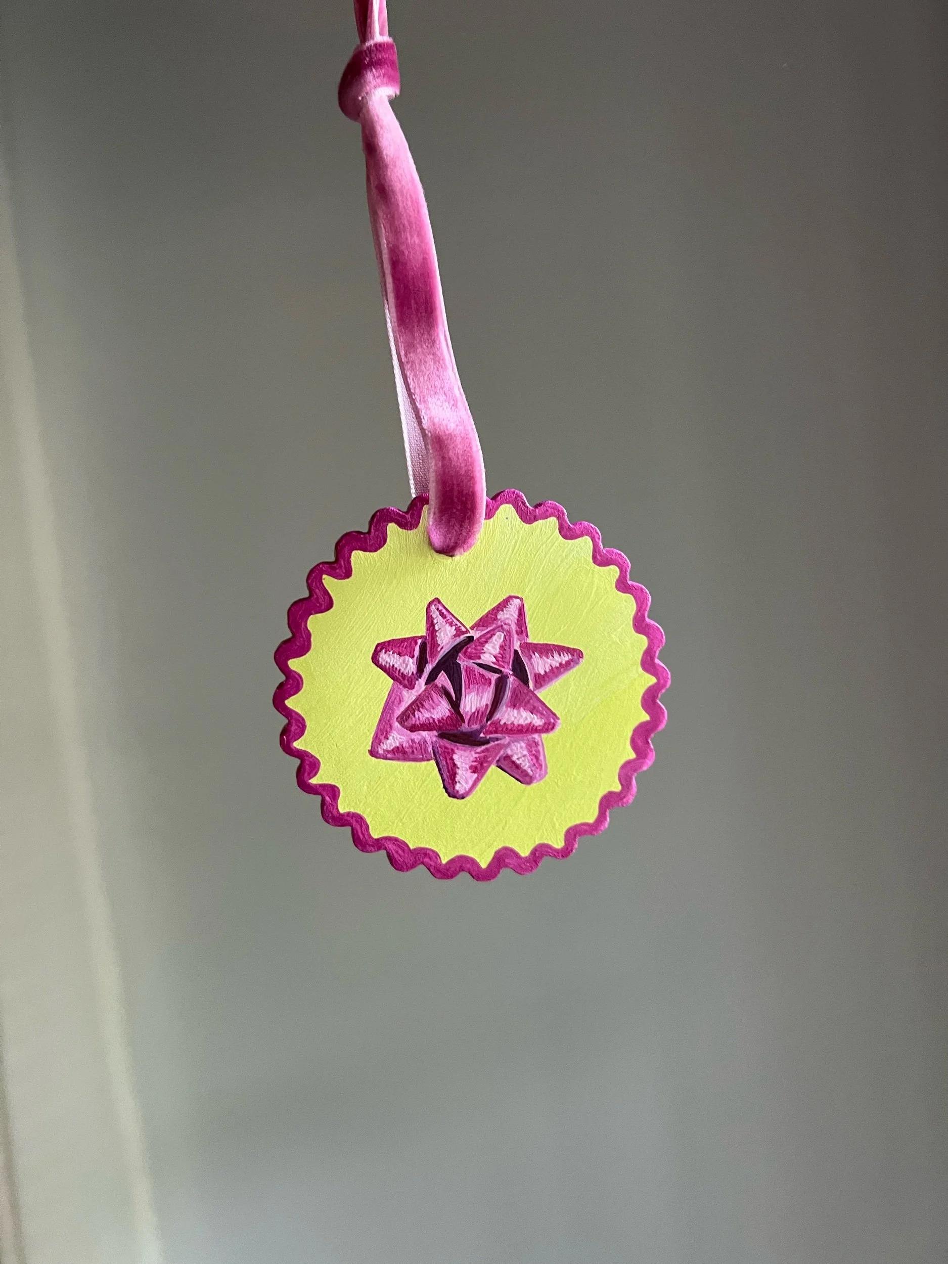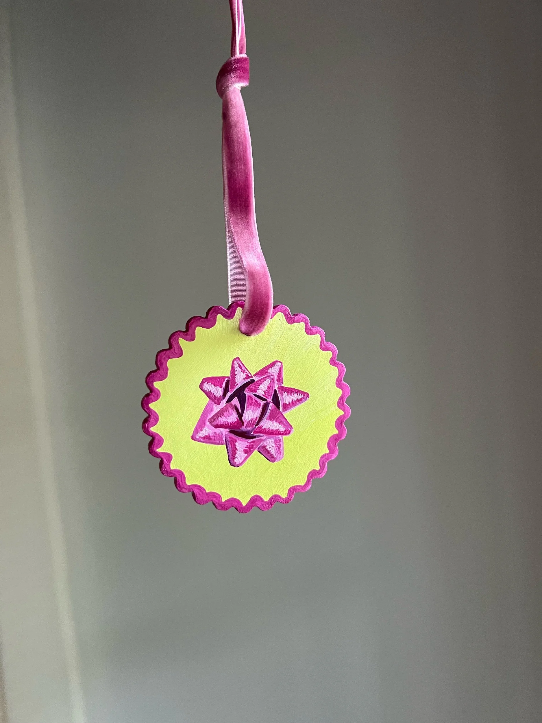 Image 1 of 3 Image 2 of 3 Image 3 of 3 Magenta Gift Bow $42.00 Hand made bisque ornamentHand paintedVelvet ribbon Purchase Added! Hand made bisque ornamentHand paintedVelvet ribbon