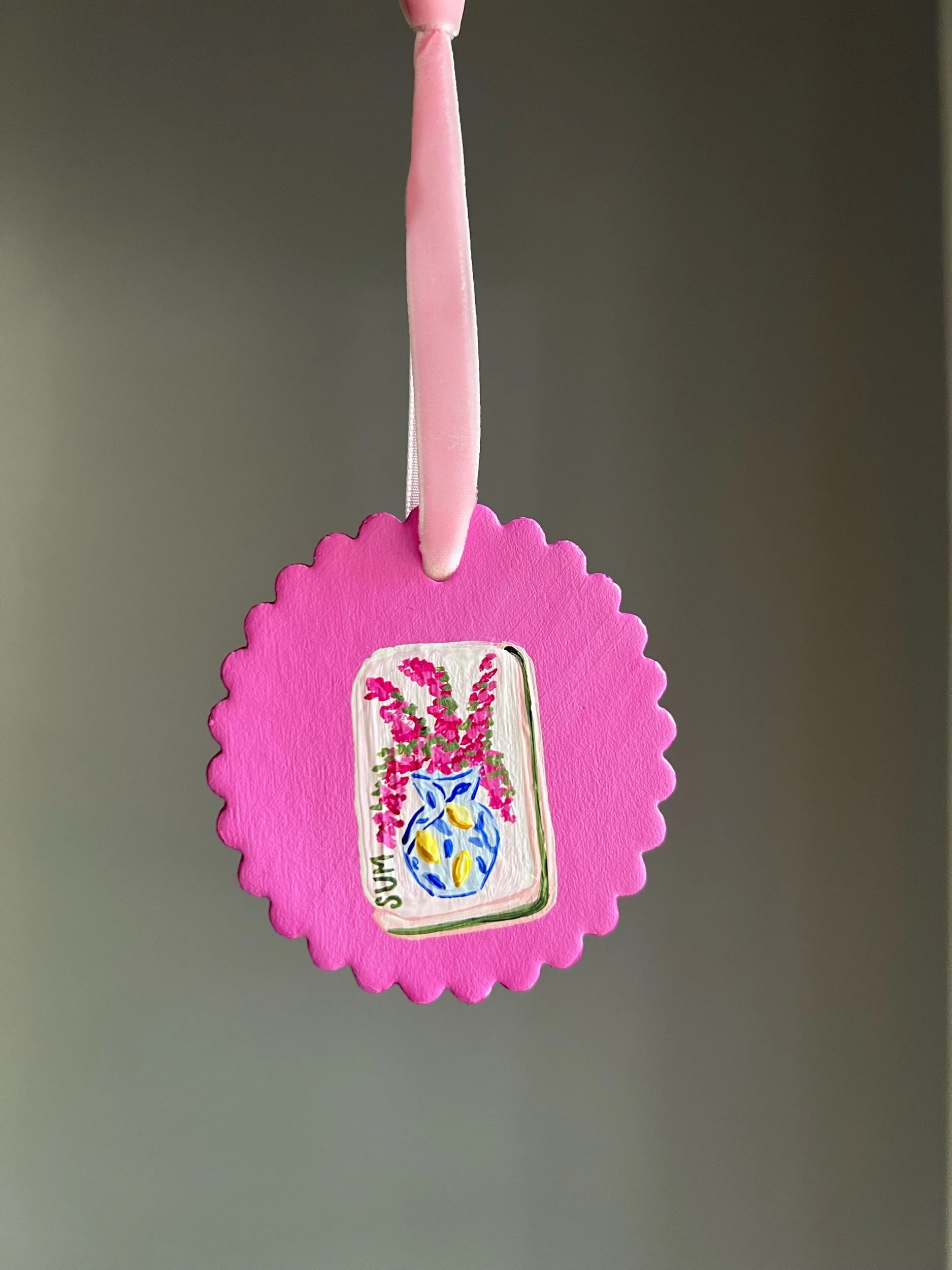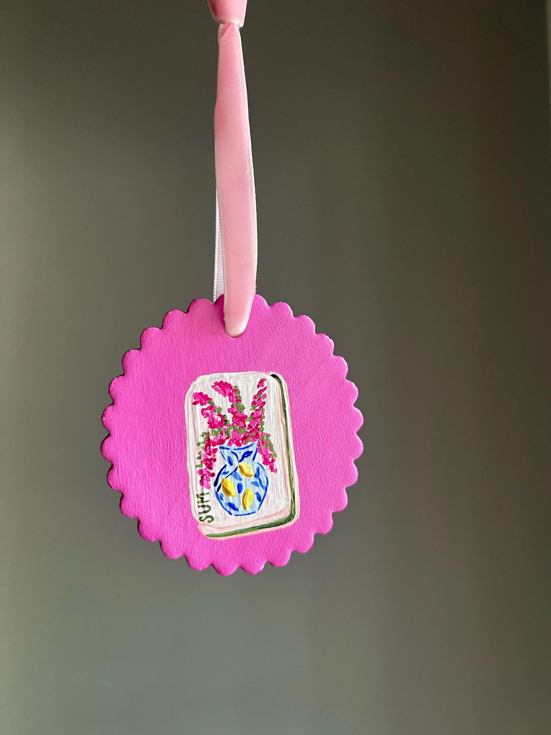 Image 1 of 2 Image 2 of 2 Mahjong Flower Tile Ornament $42.00 Hand made bisque ornamentHand paintedVelvet ribbon Purchase Added! Hand made bisque ornamentHand paintedVelvet ribbon