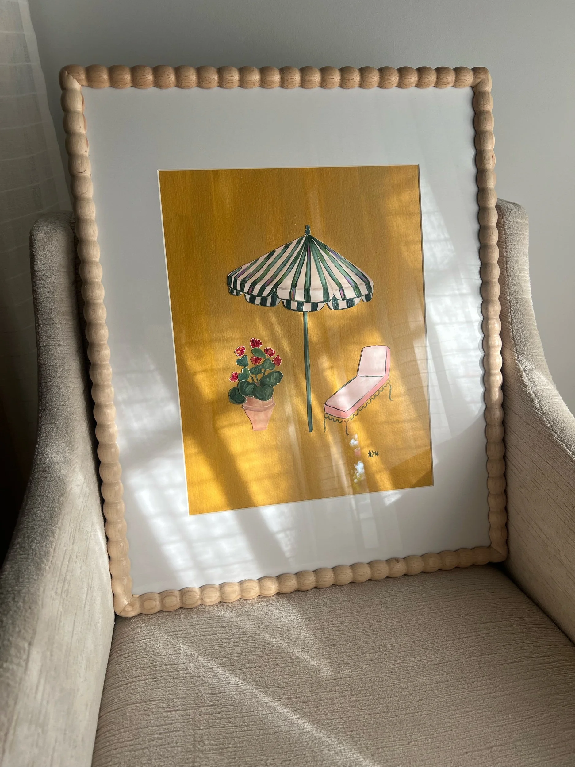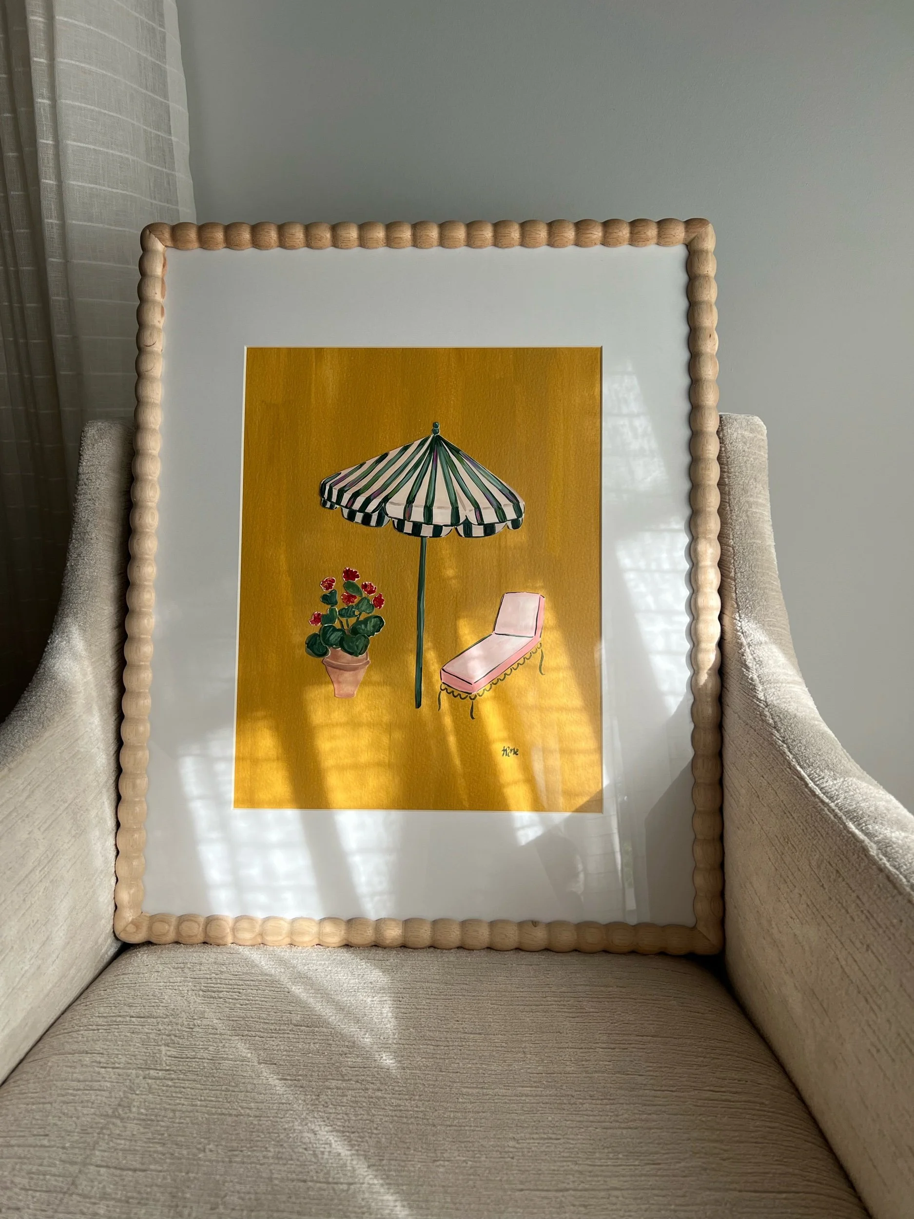 This 11x14 mixed media piece depicts a tranquil afternoon spent in the sun dappled shade of a deep emerald green and blush Italian umbrella.