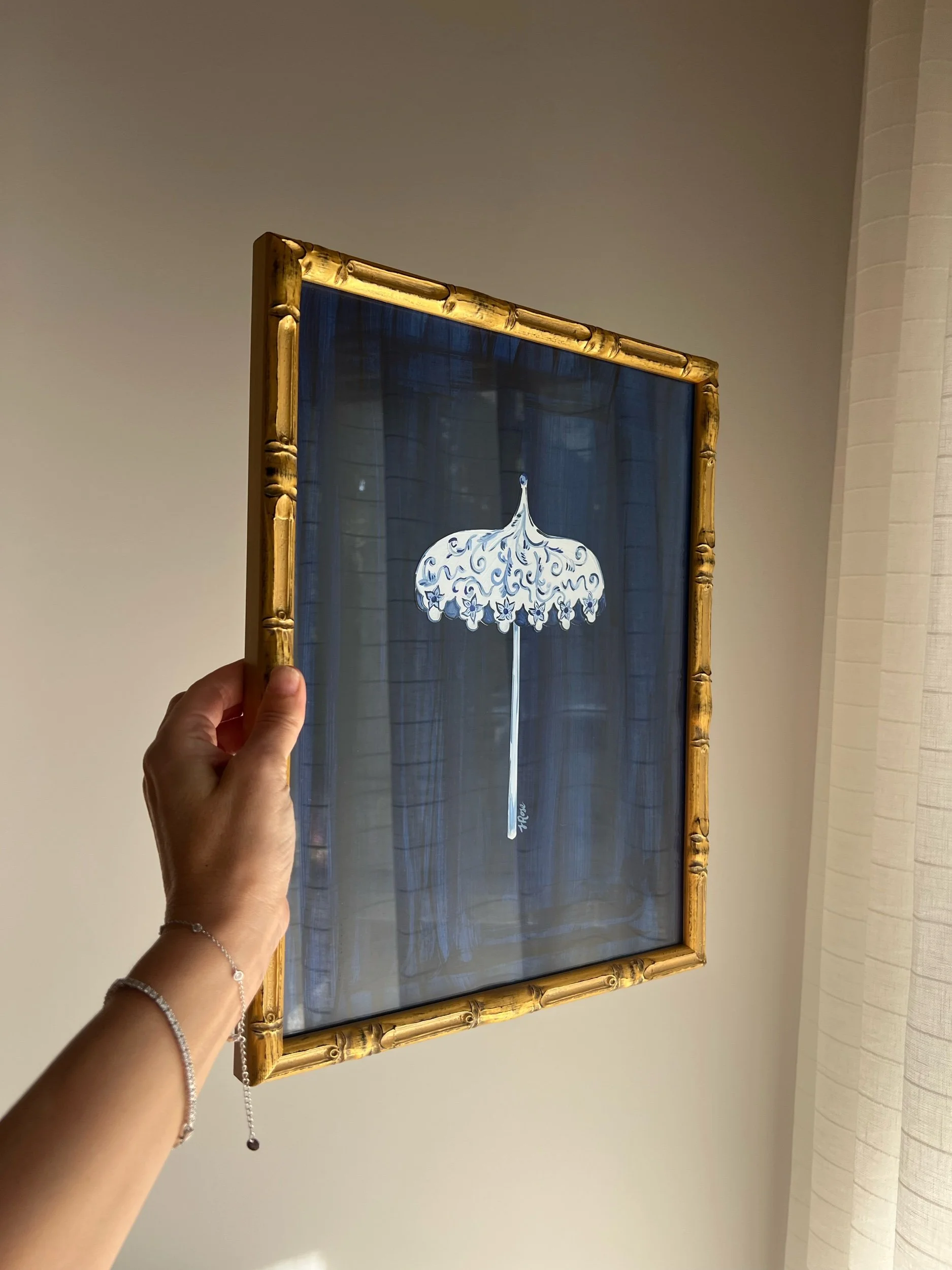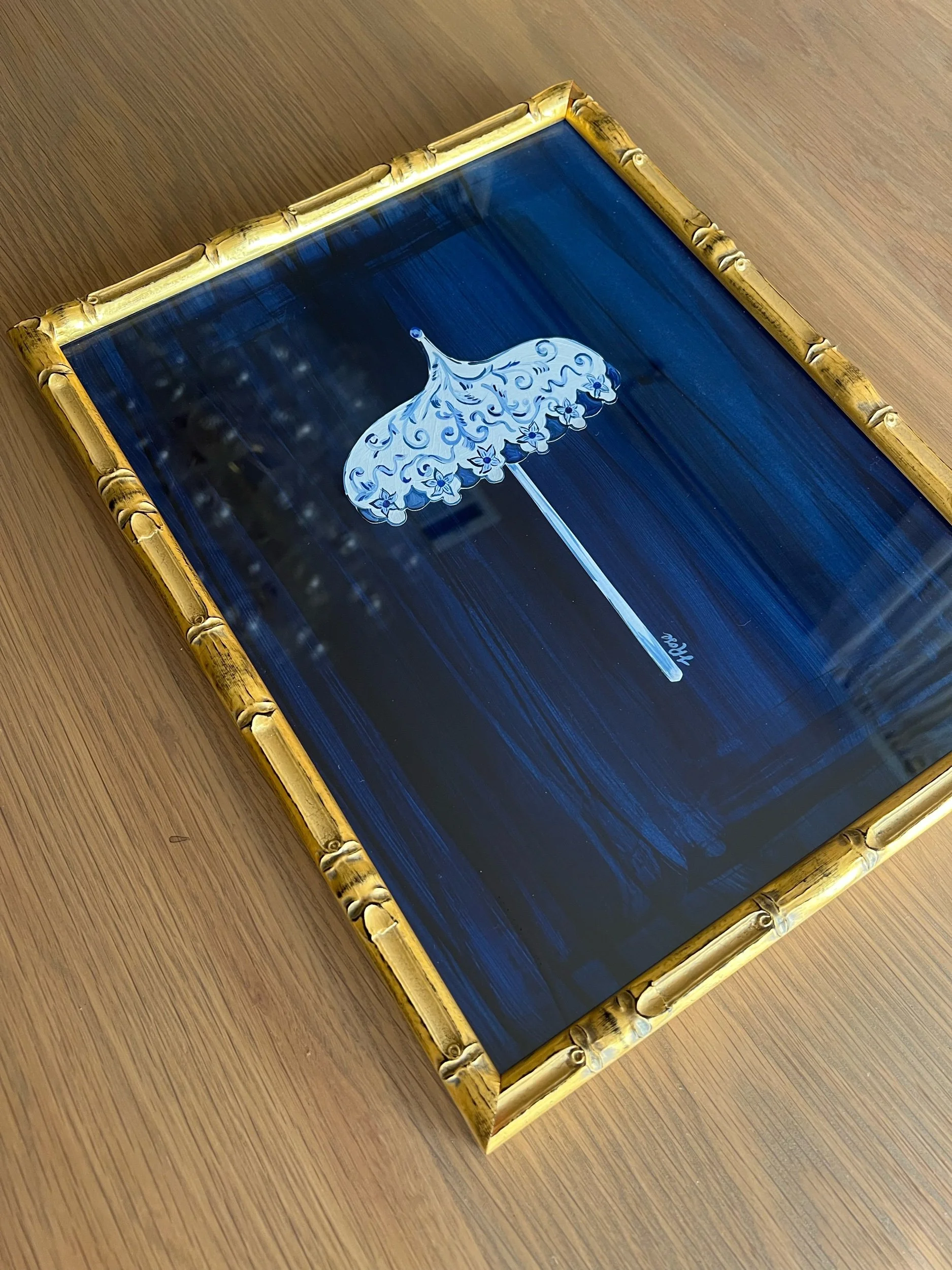 Framed in gilded bamboo, this 11x14 work evokes the quiet glamour of the Amalfi Coast. Against a deep, lustrous blue background reminiscent of the Mediterranean Sea, a single blue and white parasol stands in elegant stillness—its ornate lacework detailing whispering of sun-drenched afternoons by the sea and the timeless beauty of Italian craftsmanship. Each piece feels like a poetic pause in the midst of summer—minimal yet opulent, serene yet full of story.