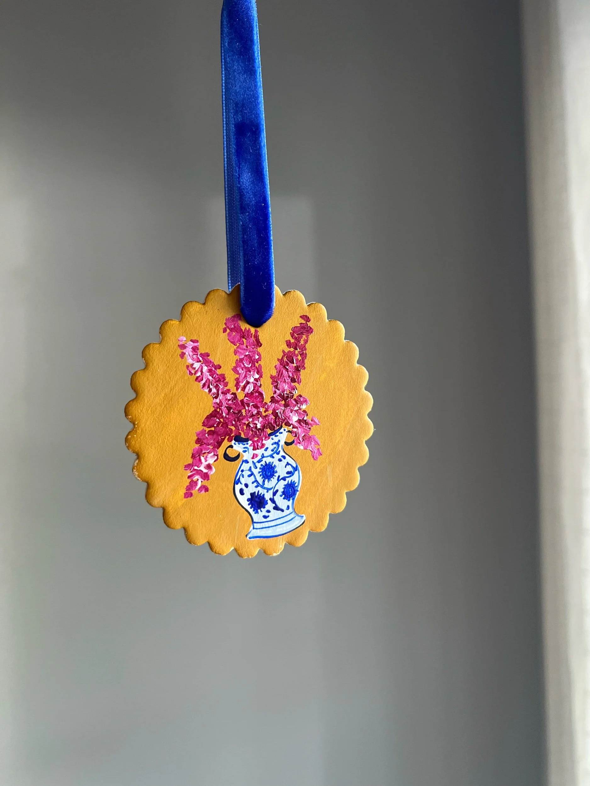 Image 1 of 2 Image 2 of 2 Bougainvillea Ornament $42.00 Hand made bisque ornamentHand paintedVelvet ribbon Purchase Added! Hand made bisque ornamentHand paintedVelvet ribbon